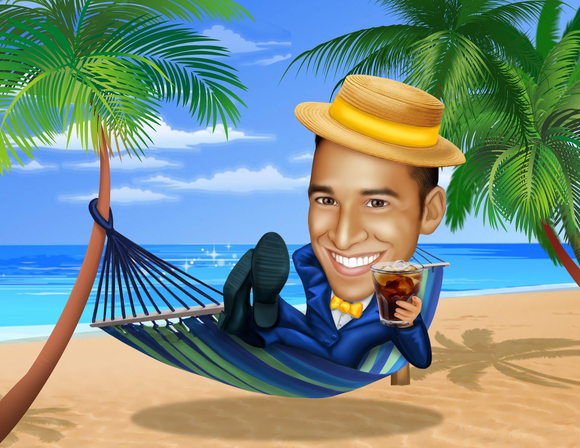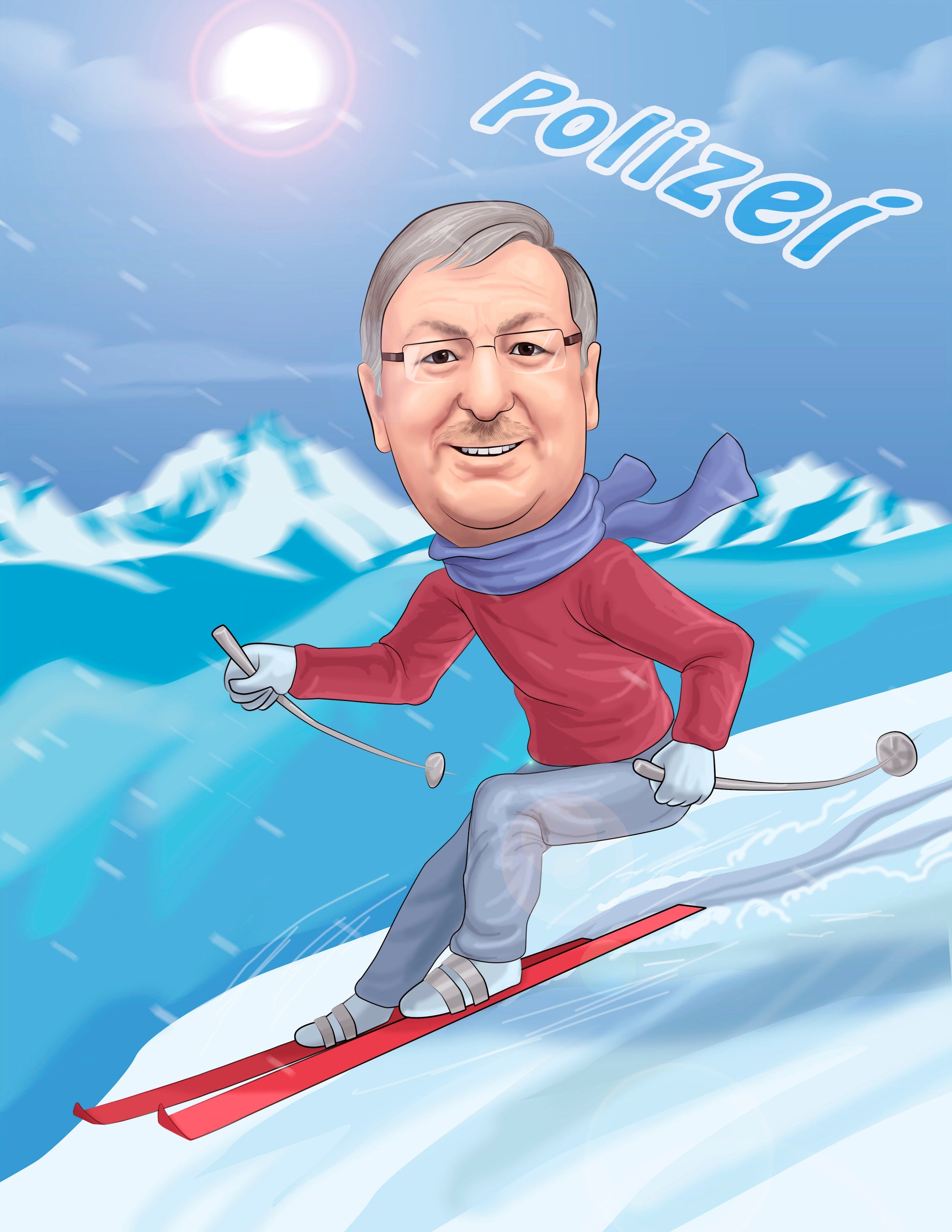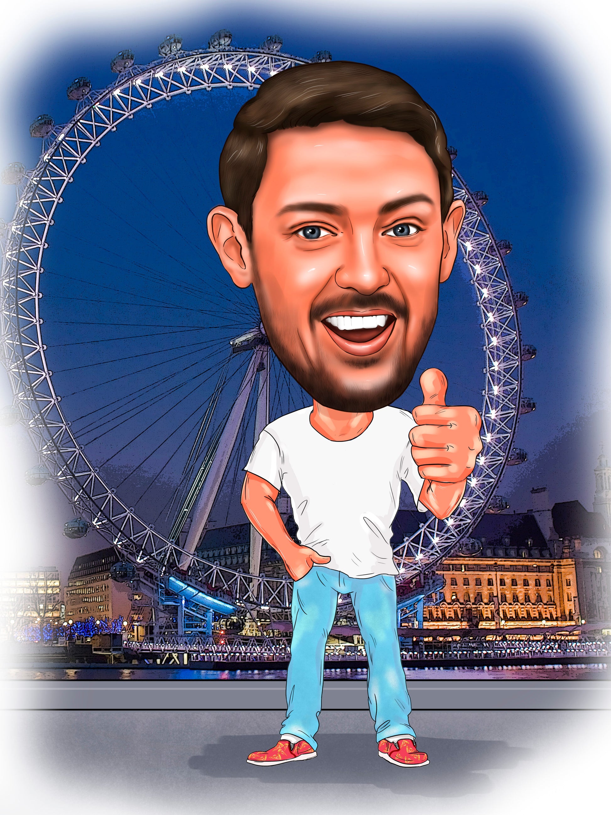 Digitaalinen värillinen kokovartalokarikatyyri henkilöstä taustalla tai ilman on loistava lahjaidea syntymäpäivälahjaksi, kollegoille tai vaikka itsellesi Karikatyyri voidaan luoda kuvauksesi mukaan. On myös mahdollista lisätä tekstiä ilman lisämaksua.